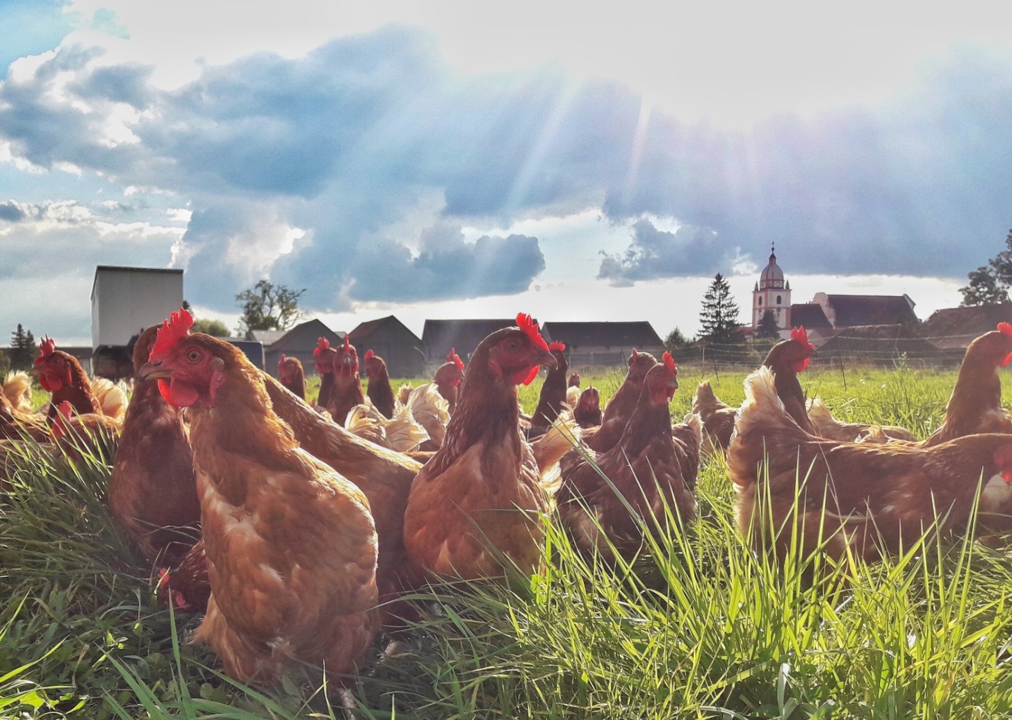 Unser Betrieb hatte schon immer Hühner zur Eigenversorgung von Eiern und die Hühner hatten immer genug Grünfläche zur Verfügung. Doch je mehr Hühner wir hatten, desto mehr wurde die Fläche beim Stall beansprucht. Die Lösung war ein mobiler Stall. 2017 entschlossen wir uns einen Mobilstall zu bauen, um den Hühnern immer genug Grünfläche zu bieten und auch den Krankheiten und Parasiten im Boden "davonzufahren". Unser erstes "Hühnermobil" entstand aus einem alten Bauwagen und wurde im März 2018 von den Hühnern bezogen. Uns war wichtig Ressourcen zu sparen und auf einen neuen Mobilstall zu verzichten. Im darauffolgenden Winter bauten wir unser zweites Hühnermobil aus einem alten Kühlanhänger. Im Dezember 2019 wurde schließlich unser drittes Hühnermobil von uns gebaut. Der erste Stall wurde verkauft und so nutzen wir seit Jänner 2020 unsere beiden Ställe mit insgesamt 340 Legehennen. Die Leghennen werden bei uns nach ca. 18 Monaten durch neue Junghennen ersetzt. Die Althennen werden zum Teil geschlachtet und als Suppenhühner angeboten. Die restlichen Hühner werden an Hobbyhalter weitergegeben.